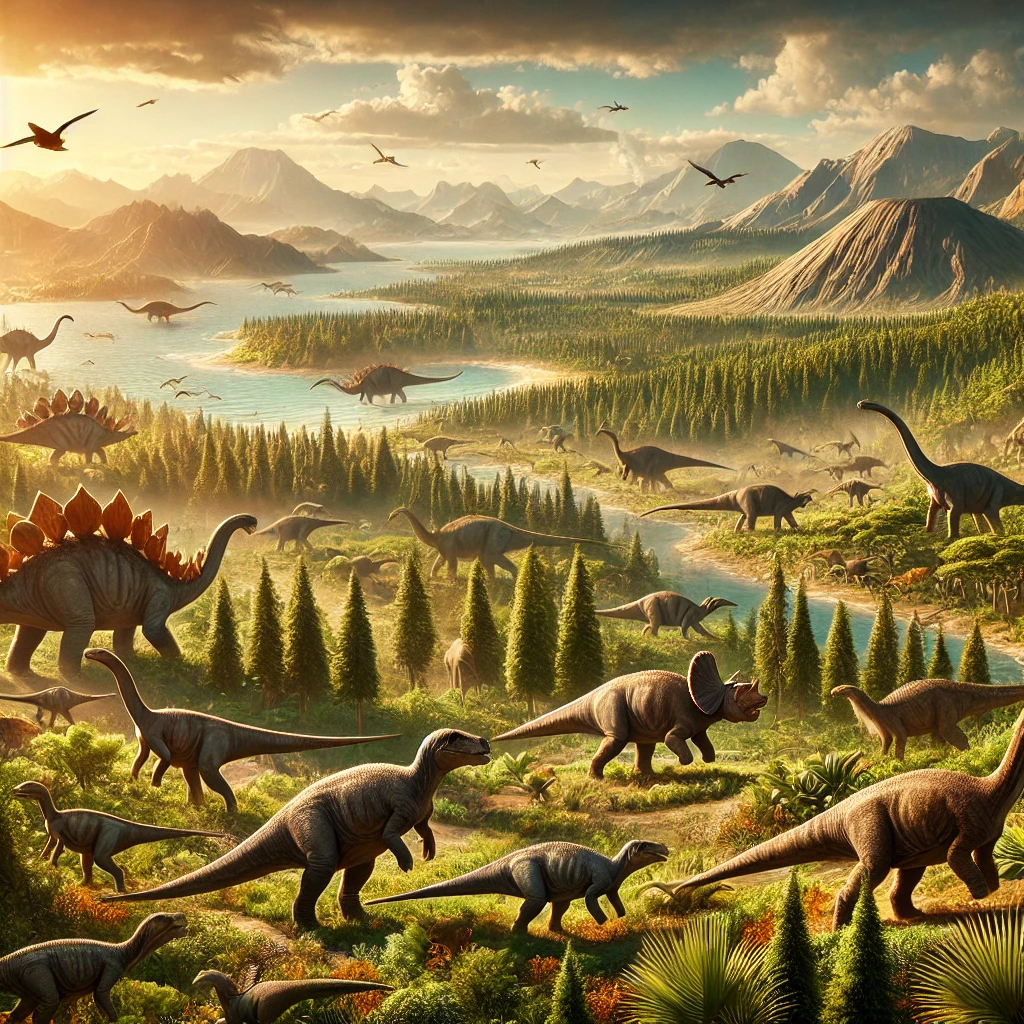 The pinnacle of dinosaur evolution and diversity. During this time, dinosaurs dominated every terrestrial ecosystem on Earth, reaching their greatest variety in size, form, and behavior. It was a time when iconic species like the massive predator Tyrannosaurus rex, the horned Triceratops, and the duck-billed Hadrosaurs roamed the land.